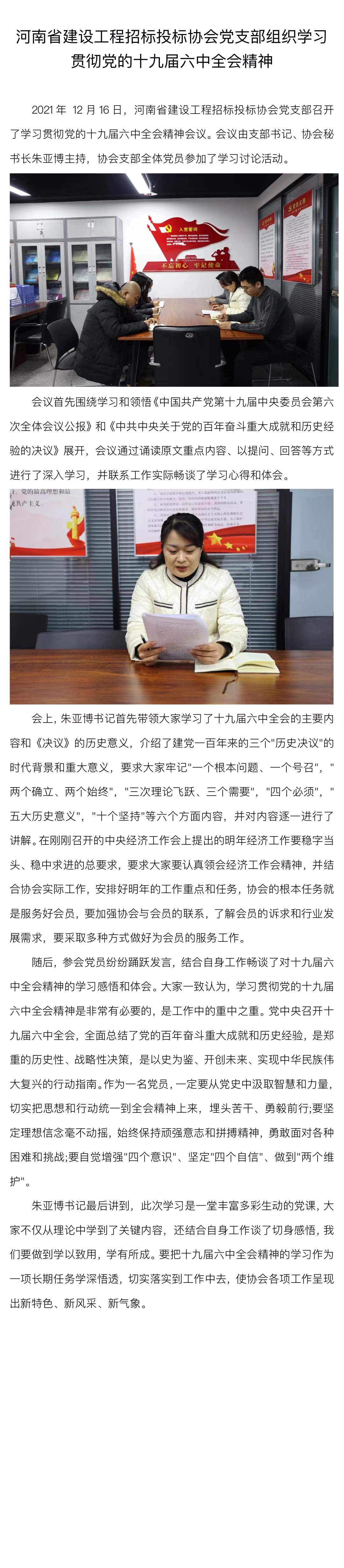 河南省建設工程招標投標協會黨支部組織學習貫徹黨的十九屆六中全會精神