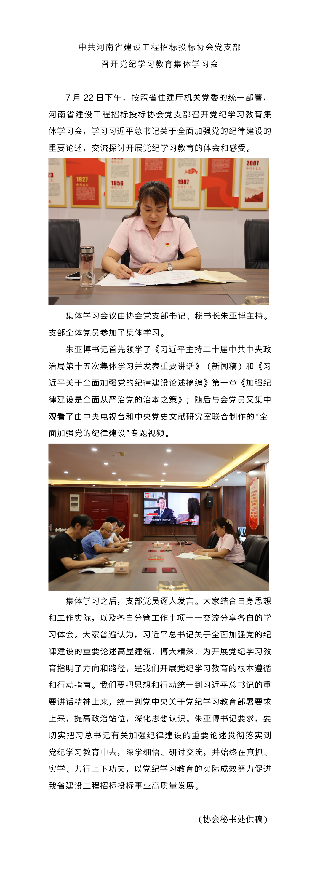 協會動態丨中共河南省建設工程招標投標協會黨支部 召開黨紀學習教育集體學習會